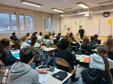 Lundi 24 octobre 2025 les élèves des classes de 3e1, 3e4 et 3e5, ont rencontré Mme Battistel, qui a eu la gentillesse d’accepter notre invitation. Cette rencontre citoyenne leur a permis de comprendre son rôle de députée à l’Assemblée nationale et dans notre circonscription. La députée leur a fait part de son engagement de femme dans la vie politique française. Les élèves ont également pu interroger Nathan, son assistant parlementaire. Les 3e4 ont été accompagnés par une journaliste du Dauphiné, Mme Bazin, qui a publié un article à ce sujet le 27 novembre.